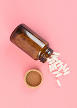 Capsule filler machine with capsules, an amber glass bottle, and clear jar of green powder #color_transparent